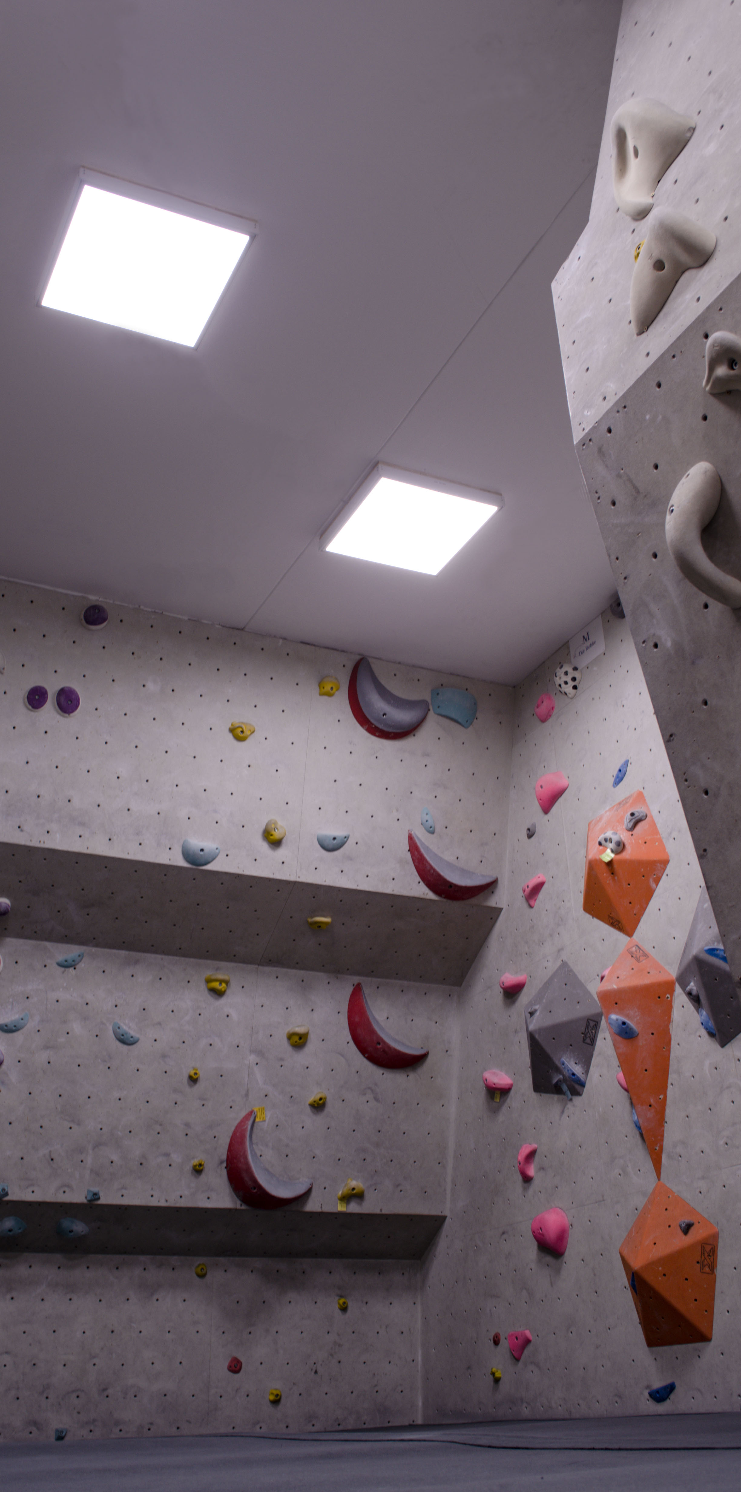 In den beiden, großen Boulderräumen wurde die Beleuchtung saniert. Bei der Konzeption und Auslegung der Beleuchtung spielten die besonderen Anforderungen dieser speziellen Sportstätte eine wichtige Rolle. Flache LED-Aufbauleuchten sorgen für ein gleichmäßig ausfüllendes Licht und garantieren eine blendfreie Ausleuchtung der Boulderwände. Um die Struktur der überhängenden Wände plastisch zur Geltung zu bringen, werden diese zusätzlich von unten in neutralweißer Lichtfarbe angestrahlt. Das LED-Linienlicht fügt sich klar in die Raumkanten ein und besteht aus sehr schmalen Aluminiumprofilen mit einer hochbelastbaren, opalen Abdeckung.
